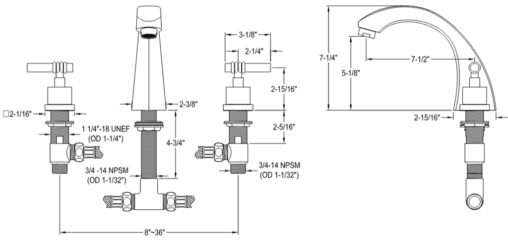- Deck mount 8" to 36" widespread 3-hole installation