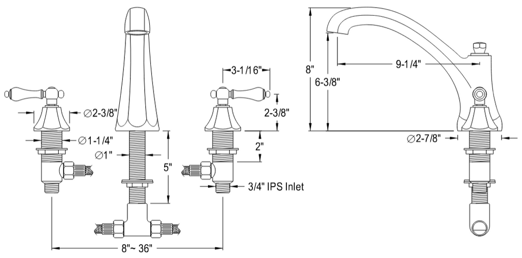• Deck mount 8" to 36" widespread 3-hole installation