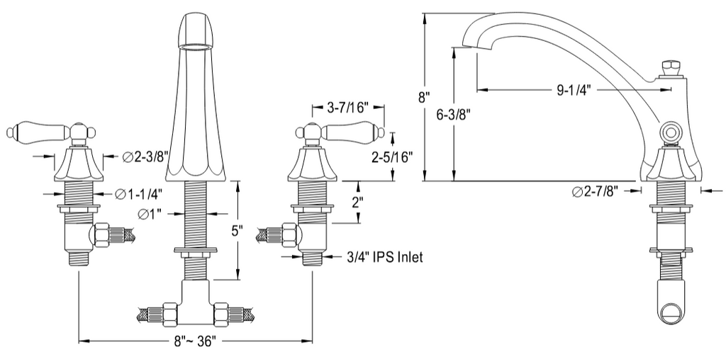 • Deck mount 8" to 36" widespread 3-hole installation