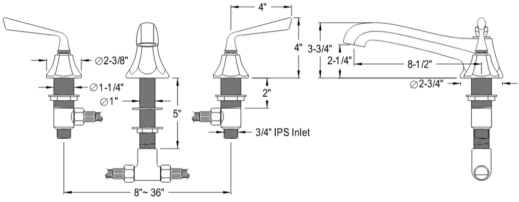 • Deck mount 8" to 36" widespread 3-hole installation