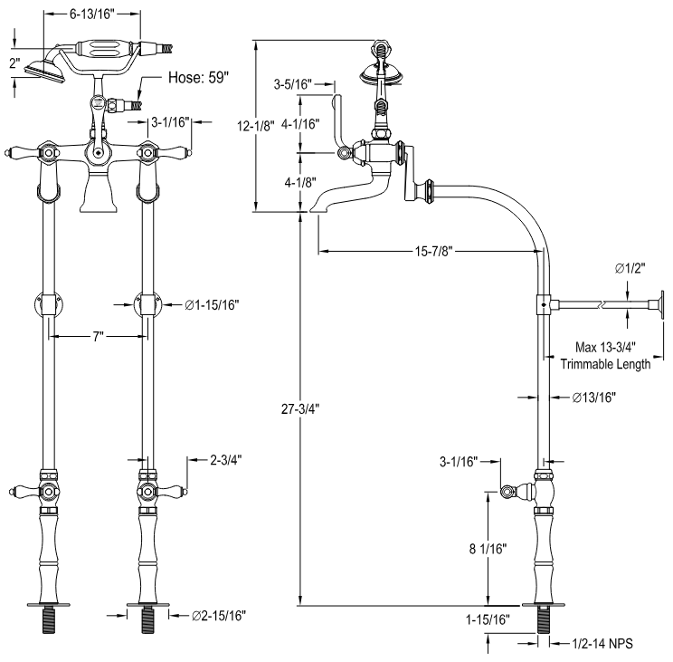 - Tub faucet body is free standing, 15-7/8" spout reach, 27-3/4" spout height