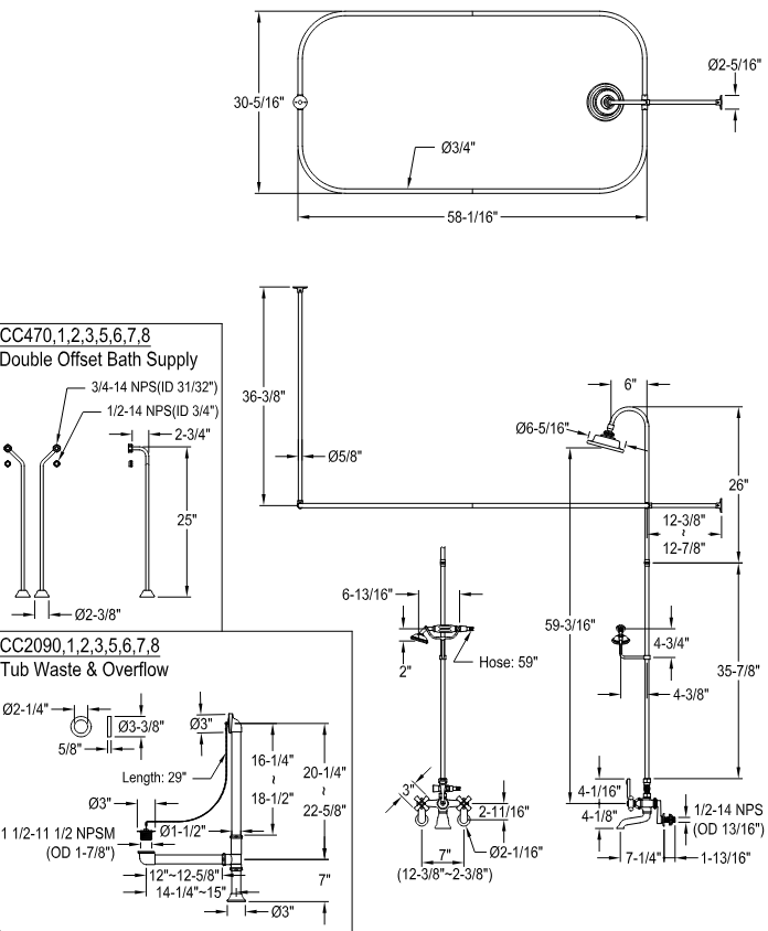 - Double offset bath supply. Dimensions 25" x 2-3/4" and 2-3/8" diameter flanges