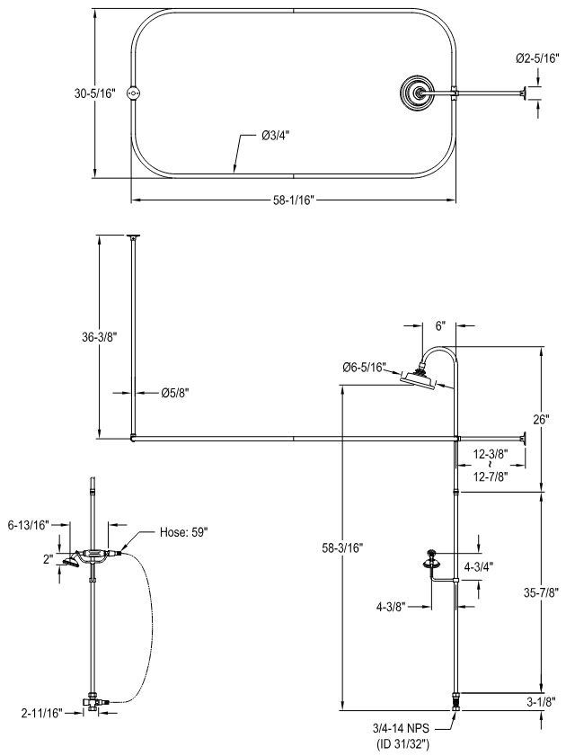 - End mount rectangular shower riser with enclosure. 36-3/8" ceiling support. Dimensions (L) 57" x (W) 30-1/2"