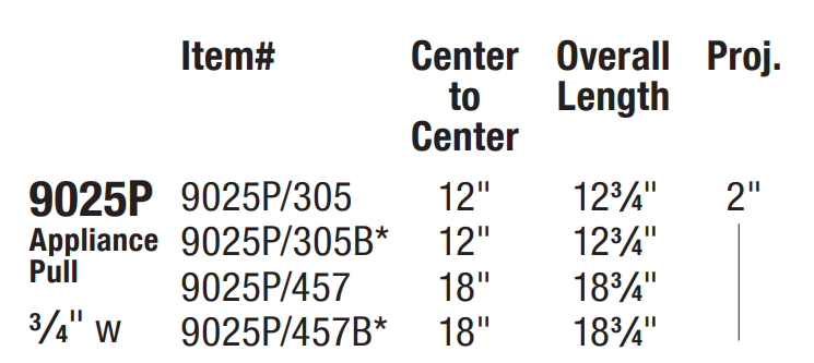 9025P/305 12" (305mm) cc., 12-3/4" oa., 3/4" width, 2" proj.