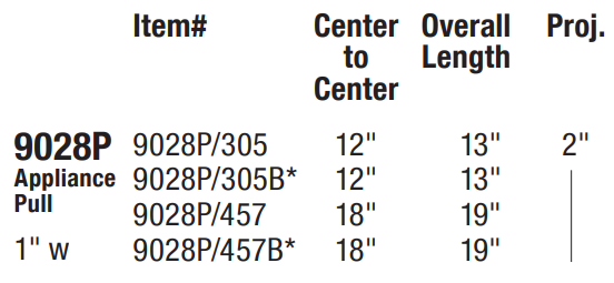 9028P/305 12" (305mm) cc., 13" oa., 1" width, 2" proj.