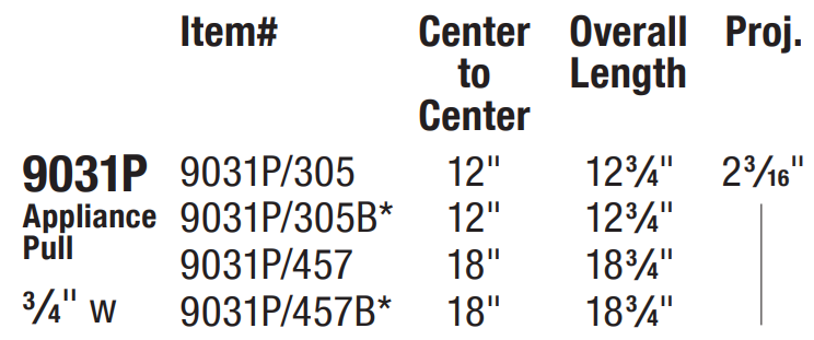 9031P/305 12" (305mm) cc., 12-3/4" oa., 3/4" width, 2-3/16" proj.