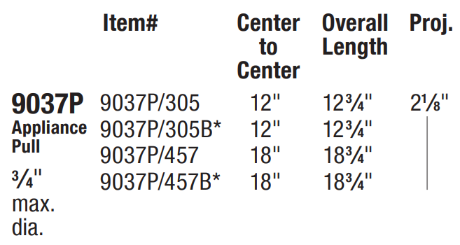 9037P/305 12" (305mm) cc., 12-3/4" oa., 3/4" max. dia., 2-1/8" proj.