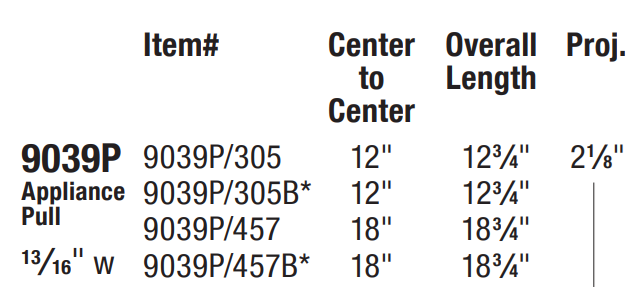 9039P/305 12" (305mm) cc., 12-3/4" oa., 13/16" width, 2-1/8" proj.