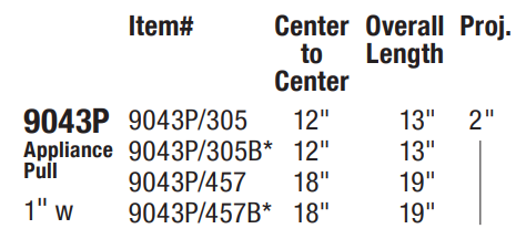 9043P/305 12" (305mm) cc., 13" oa., 5/8" width (1” width at base), 2" proj.