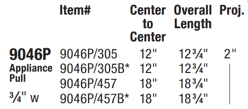 9046P/305 12" (305mm) cc., 12-3/4" oa., 3/4" width, 2" proj.