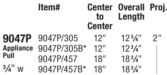 9047P/305 12" (305mm) cc., 12-3/4" oa., 3/4" dia., 2" proj.