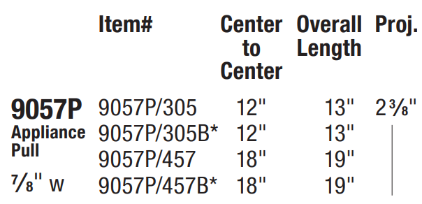 9057P/305 12" (305mm) cc., 13" oa., 7/8" max. dia., 2-3/8" proj.
